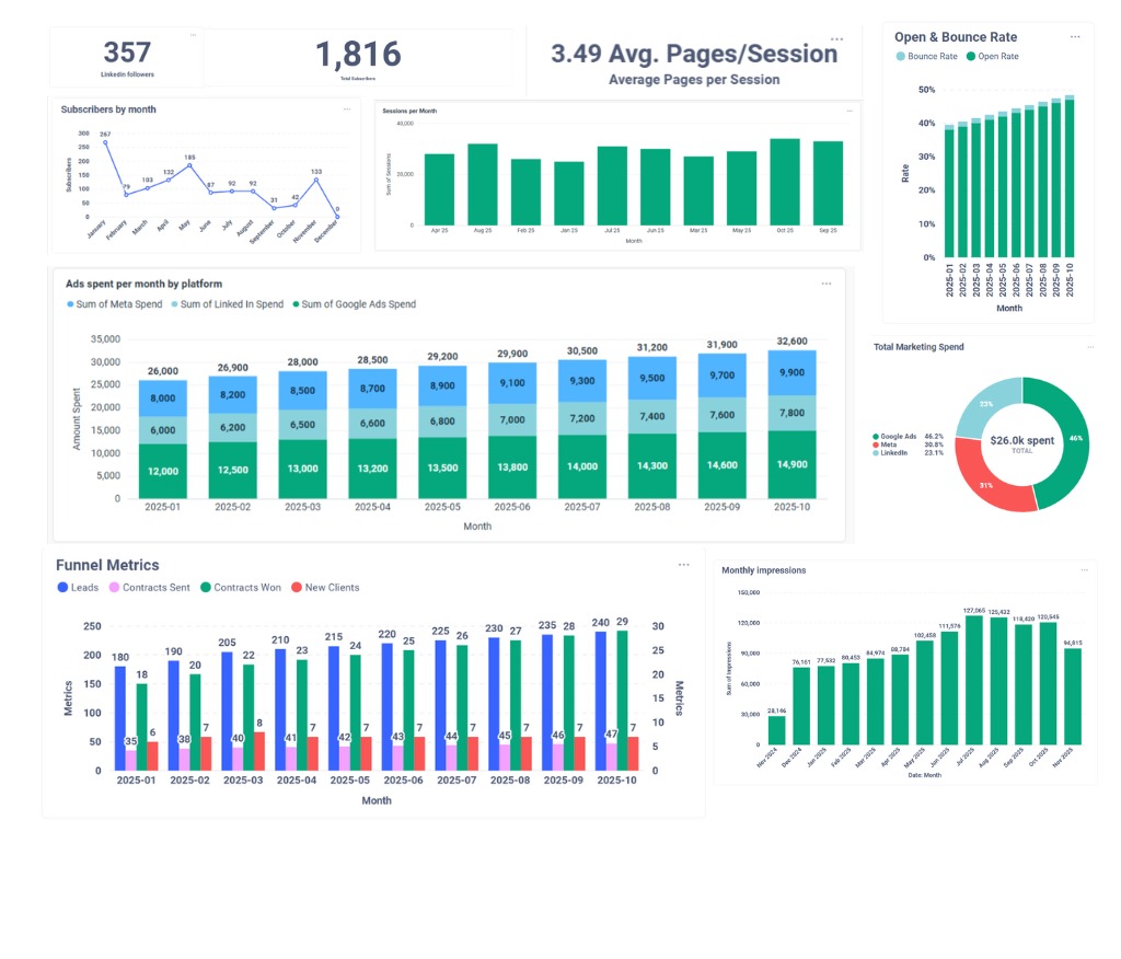 Dashboards: Campaign performance, multi-channel attribution, and ROI tracking.