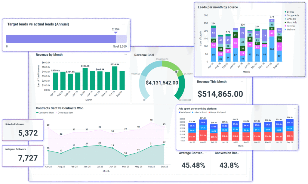 The dash goes further than simply connecting your existing data. We help uncover what’s missing to reveal the metrics and insights you may not even be tracking yet, because the most valuable breakthroughs often come from the gaps you didn’t know existed. Armed with this information, we build powerful, easy-to-understand dashboards designed specifically for your business.